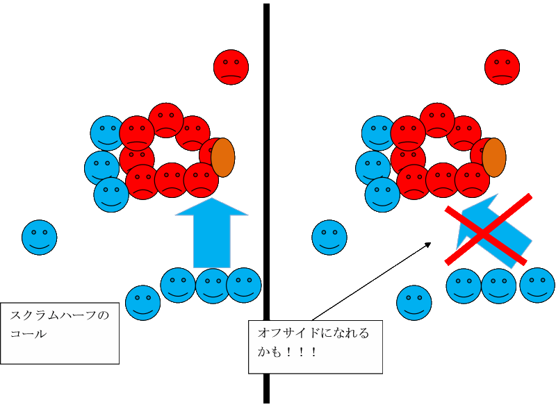 着く前だとファールになってしまうので注意!目的はオフェンスが準備をしなおさなくてはならないようにボールを後ろに下げることです。ここでもまたタイミングが違いを見せます。こつ:ディフェンスのブロックは3人以上になってはいけない。フッカーはできれば入らない方がよい。でも、もし9番がインサイドに控えているときは入ってもより。ディフェンスをここでたくさん使ってしまうと、もしすぐにボールが出された場合、ディフェンスの人数が足りず、穴ができやすくなてしまうからだ。