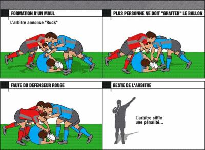 ボールが地面にあるとすぐに、ラックを作る。そして後ろから2人のプレーヤーがぶつかって、押す。彼らは手でボールを触ってはいけない、押してボールを手に入れる。(足では触っても良い)