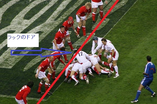 同時にゲインライン(ENG : advantage line, gain line, FR: ligne d’avantage) も存在する。そのラインはボールのある位置である。ラックに加わる時は、すでにラックを押している仲間が作る、ドア(イメージ)のなかに入っていかなければならない。つまり横から押したりしてはいけなくて、後ろから押すということである。